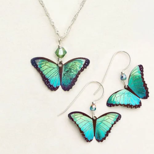 click to enlargeButterfly of Transformation Jewerly $65These iridescent wings tell a story of growth, color, and the beauty of becoming. The moment light hits these wings, everything changes. Iridescent greens ripple like sunlight on water, catching glances and starting conversations. Inspired by the butterfly’s metamorphosis, the design duo of Holly Yashi has created a collection that brings together bold color, delicate movement, and symbolic meaning—an everyday reminder that change looks good on you. - Available as necklace or earrings. - Made from lightweight niobium, color-shifted to reveal a spectrum of shimmering greens. - Necklace features a petite butterfly pendant with a crystal accent, hanging from an adjustable sterling silver chain (16"–20"). - Earrings measure 1 1/8"L × 1" W, with sterling silver ear wires and a faceted crystal bead detail. - Handmade in California.Quantity: Add to Cart