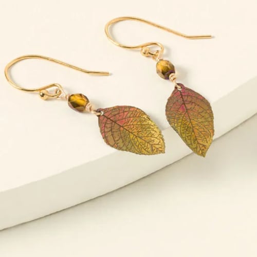 click to enlargeChanging Leaves Earrings $50Embrace change with these earrings that capture the many hues of an autumn leaf’s transformation. Little in life is permanent, but change is an ever-present force in our existence. Holly Hosterman and Paul "Yashi" Lubitz’s earrings embrace this metamorphosis, capturing the many hues of an autumn leaf’s transformation. - Each leaf features delicate coloring, intricate details, and a subtly hammered finish. - Made with niobium, gold overlay, and Austrian crystal. - Earrings are 2.5"L x 1"W x 2.5"H. - Handmade in California.Quantity: Add to Cart