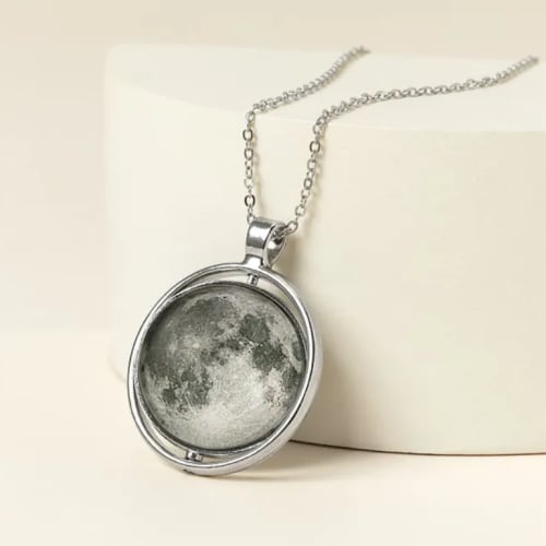click to enlargeFull Moon Fidget Necklace $36Carry the calming celestial energy of the full moon close to your heart with this eye-catching spinning necklace. A symbol of intuition, clarity, and transformation, the full moon is truly a sight to behold. Taking inspiration from this bright celestial body, maker Samantha Wal created her eye-catching lunar pendant necklace. The double-sided image spins freely within the frame, making it a delightful fidget accessory and shimmering statement piece in one. - Fashioned from rhodium-plated brass and glass cabochon. - 1.5" diameter pendant hangs from a 24" chain. - Handmade in Maryland.Quantity: Add to Cart