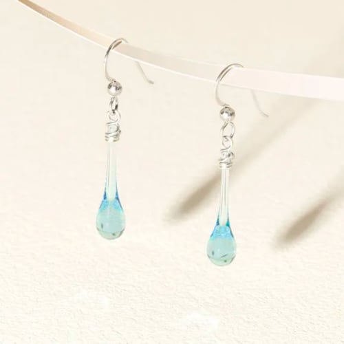 Reminiscent of a water droplet frozen in time, these elegant, minimalist earrings are crafted of sun-melted bottles and recycled silver.