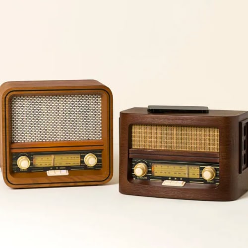 click to enlargeThrowback Speaker with Bluetooth & Radio $90Mid-century style meets 21st century tech in this love letter to audiophiles and retro seekers. - Choose between one of two models: one with wireless charging or one that requires a power outlet connection (now that's retro). - Made from real ash wood, each conversation-starting speaker features a caning-style weave reminiscent of mid-century stereo systems. - Use the vintage-inspired knobs to turn up the volume or dial in local AM/FM radio stations. - Switch to Bluetooth® with the touch of a button to enjoy playlists from your mobile devices, tablets, and more. - Both also include an AUX cable for connecting to your favorite music player.Quantity: Add to Cart