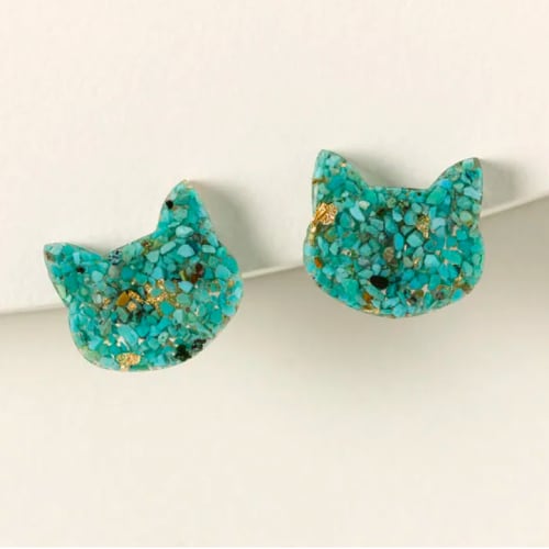 click to enlargeTurquoise Cat Studs $28Camille Kohler's vibrant crushed turquoise and gold-leaf studs make a statement on your ears: Meow, baby! - Camille makes each by hand, sealing crushed turquoise and gold leaf in resin, then setting them on surgical steel backings. - .5"L x .5"W - Handmade in Georgia.Quantity: Add to Cart